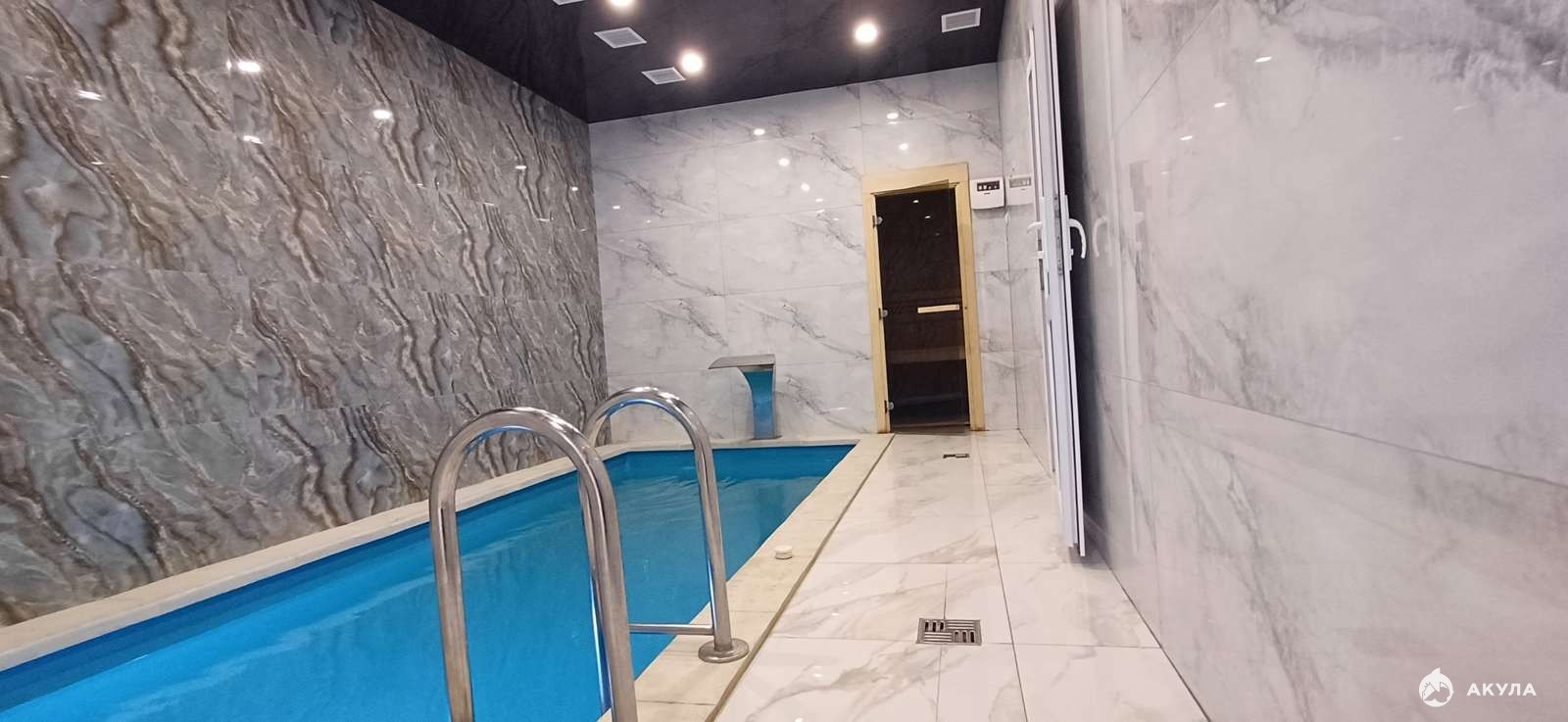 -на первом этаже большая кухня-гостинная, сауна, бассейн, душевая кабина, санузел, есть выход в задний двор